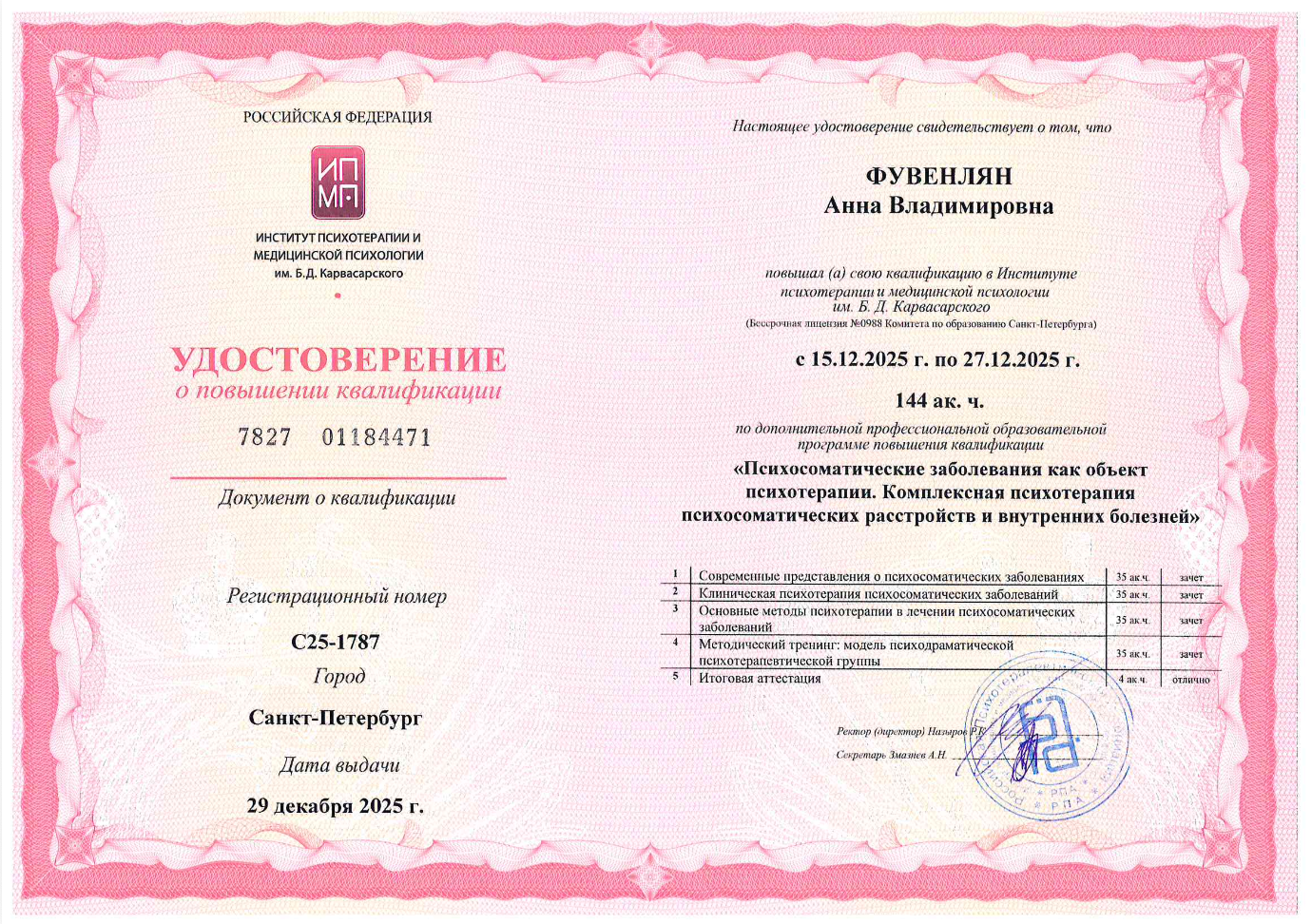 «Психосоматические заболевания как объект психотерапии. Комплексная психотерапия психосоматических расстройств и внутренних болезней» (144 ак.ч.) Институт психотерапии и медицинской психологии им. Б.Д. Карвасарского. Декабрь 2025г.