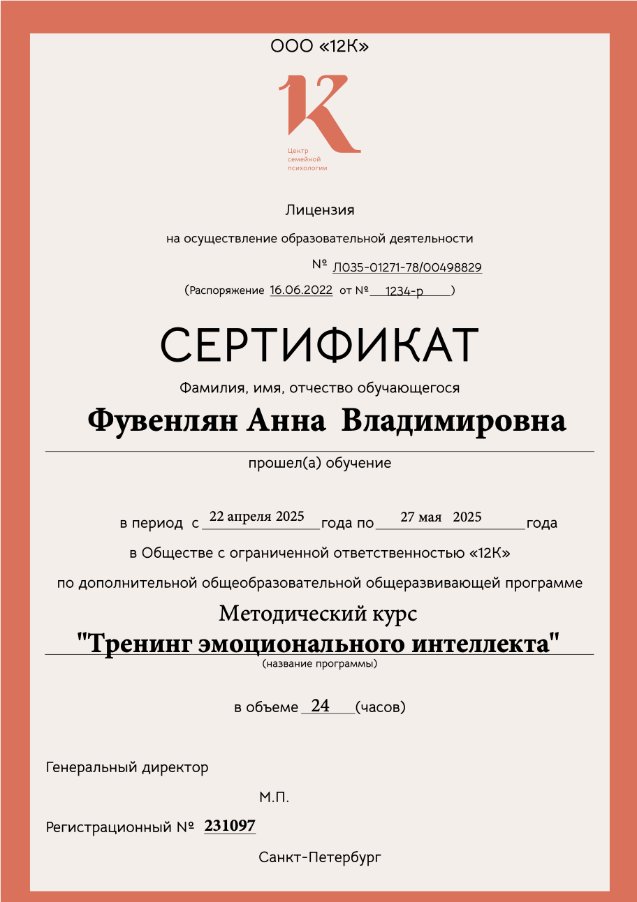 Методический курс «Тренинг эмоционального интеллекта» (24 ч.). ООО «12К». Апрель-май 2025г.
