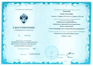 - «Методическая подготовка ведущих групп» (72 ак.ч.) СПбГУ (2016)