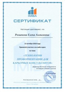 - «Технологии профориентации для карьерных консультантов». Институт менеджмента, инноваций и бизнес-анализа (IMIBA) (2018)