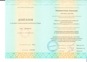 - Профессиональная переподготовка «Управление организацией отдыха и оздоровления детей и молодежи» (250 ак.часов) (2020) ООО «Архитектура Будущего»