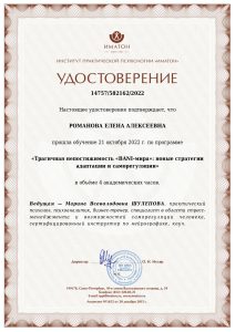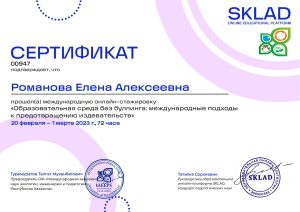 - «Образовательная среда без буллинга: международные подходы к предотвращению издевательств». Международная онлайн-стажировка (72 часа). Online educational platform SKLAD (2023)