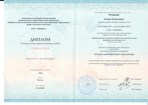 - Профессиональная переподготовка «Методист дополнительного образования» (340 часов). АНО ДПО «Национальный исследовательский институт дополнительного образования и профессионального обучения» (2023)