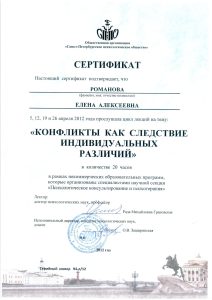 - «Конфликты как следствие индивидуальных различий» (20 ак.ч.) Санкт-Петербургское психологическое общество (2012)