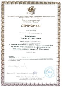 - «Старшеклассники: от диагностики к оптимизации обучения, социализации и профессиональному самоопределению учащихся 7-11 классов» (32 ак.ч.) Институт практической психологии «Иматон» (2013)
