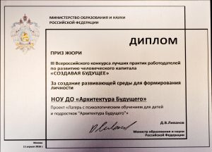 2016 год — Лагерь с психологическим обучением для детей и подростков “Архитектура Будущего” становится призером III Всероссийского конкурса лучших практик работодателей по развитию человеческого капитала «Создавая будущее», организованного Международной ассоциацией корпоративного образования (МАКО) и получает награду в номинации “За создание развивающей среды для формирования личности”