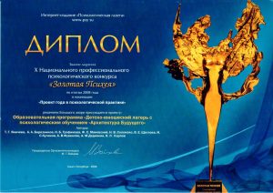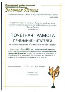 2009 год — Лагерь с психологическим обучением для детей и подростков “Архитектура Будущего” становится Лауреатом профессионального психологического конкурса «Золотая Психея — 2009» в номинации «Проект 2009 года в психологической практике». Наряду с этим получает почетную грамоту — Признание читателей организатора конкурса, интернет-издания «Психологическая газета».