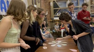 Ведущими стали Маша, Вася, Тима, Даша, Эмиль, Юля, Саша и Полина. Для начала Маша и Вася провели конкурс. Суть его заключалась в том, чтобы из команды был выбран один мальчик, который получит бумажку с локацией для свидания, после чего команда должна сочинить стих-приглашение для девочки из другой команды. Было очень интересно.