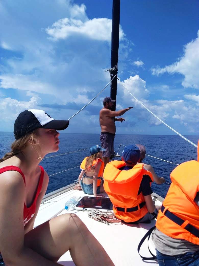Швертбот — маленькая легкая яхта, которая носится по волнам, как бешеная, наклоняясь то вправо, то влево, будто невиданная птица. Белые паруса несут тебя в просторы морского океана. Все ребята с удовольствием сидели на руле и на школах. Ведь это так интересно и по-любому тебя ждут незабываемые приключения! Например, увидеть черепаху, спрыгнуть на ходу в кристально чистые воды, чуть не перевернуться или.. обнаружить, что мачта ну очень сильно наклоняется, как, например, произошло 21 июня. Но Вероника и Настя с юмором отнеслись к сложившейся ситуации и смело довели швертбот до берегов Закинтоса. Тройное ура!!! Но если бывают непростые ситуации из-за слишком сильного ветра, то бывает и наоборот. Во вторую половину дня 18 июня нас поджидал штиль. Паруса встали в мертвую зону (левентик — положение против ветра, когда лодка не может идти, примечание редактора) и путешествие по морю пришлось остановить. Но на скуку мы не жаловались, ведь швертбот это по-любому интересно и незабываемо!