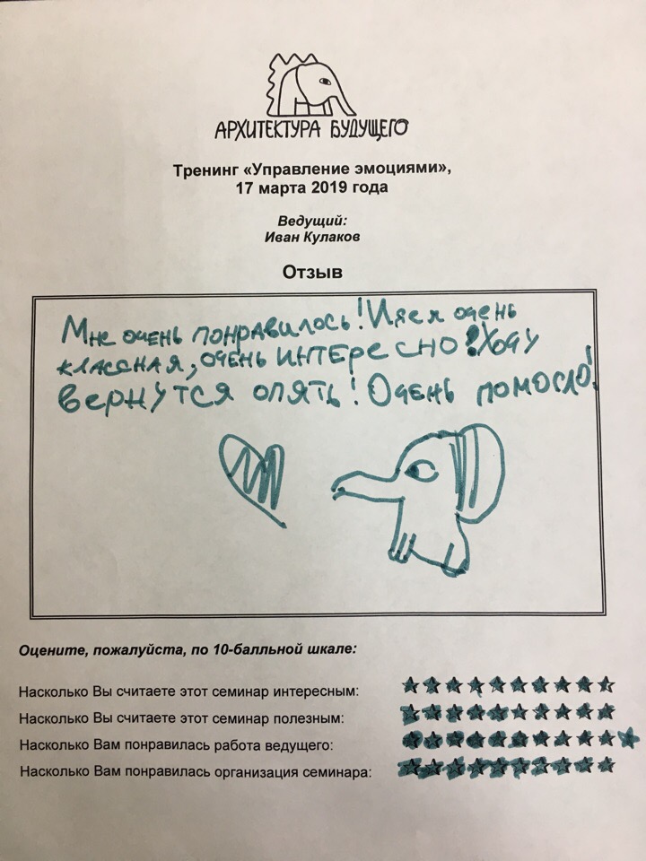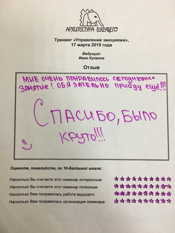 Отзыв№ 2: Семинар актуальный, интересный, полезный. Удачное сочетание теоретической и практической части. Атмосфера семинара доброжелательная, открытая. Спасибо))) Успехов!