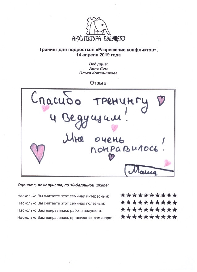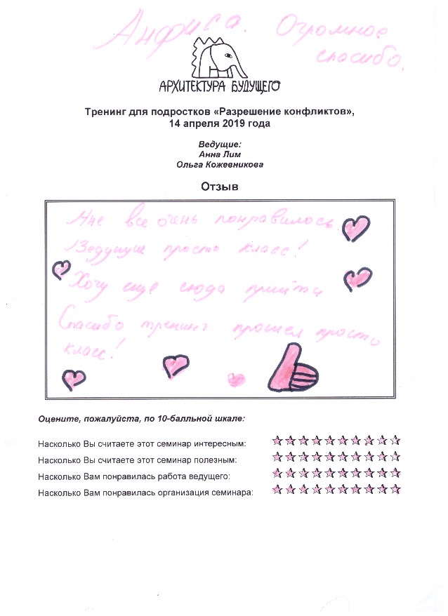 Отзыв№ 2: Семинар актуальный, интересный, полезный. Удачное сочетание теоретической и практической части. Атмосфера семинара доброжелательная, открытая. Спасибо))) Успехов!