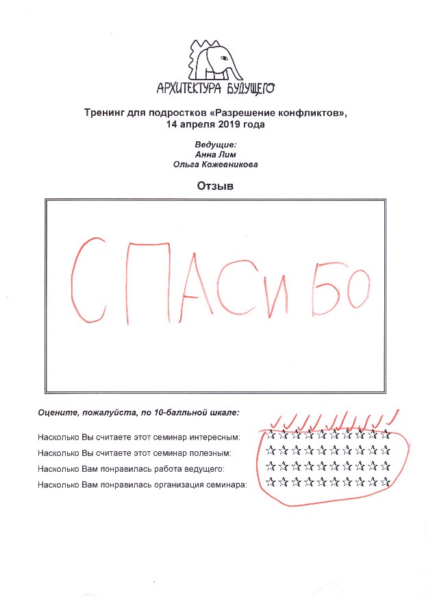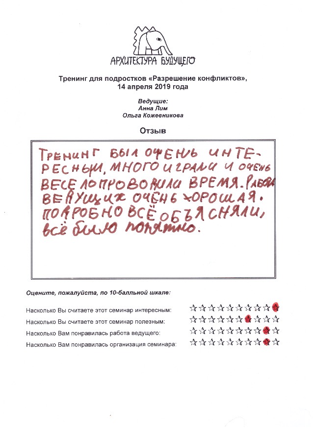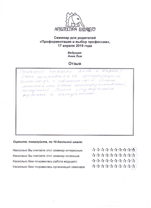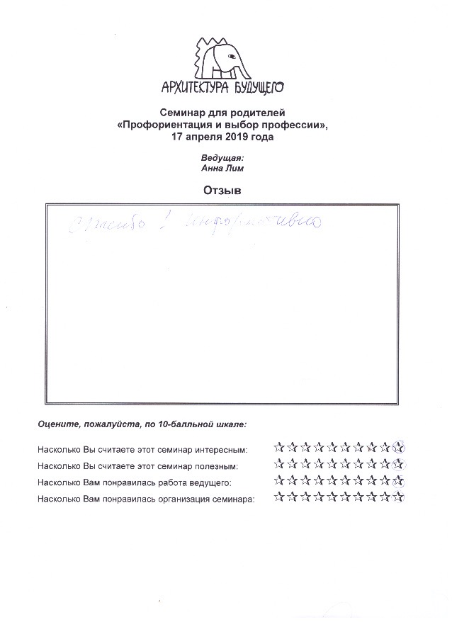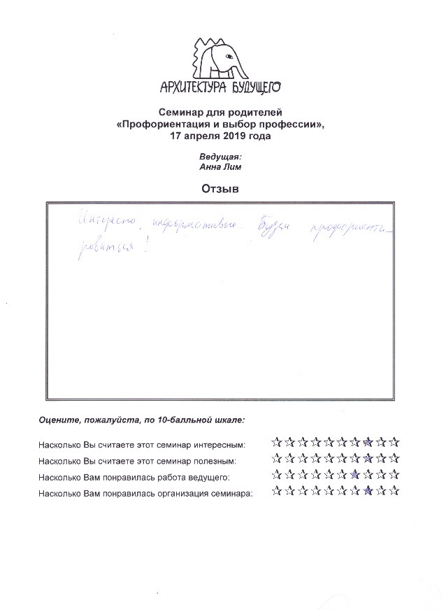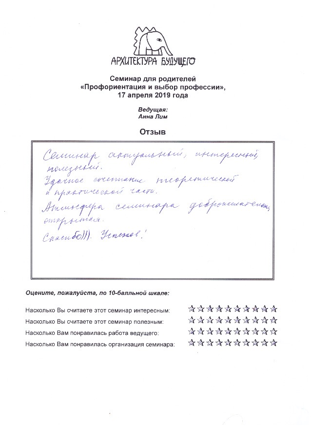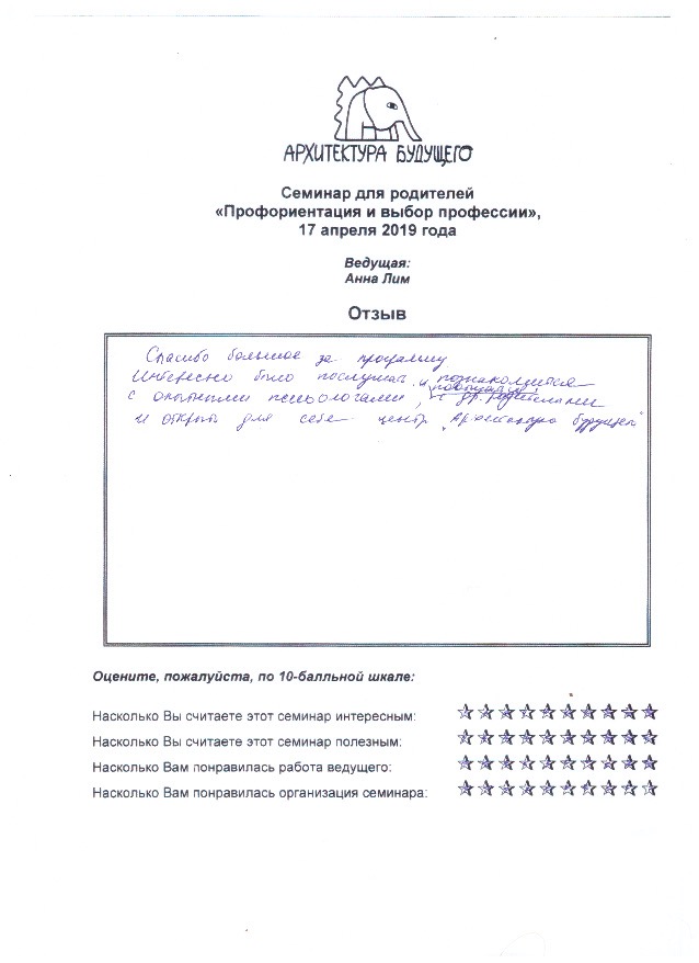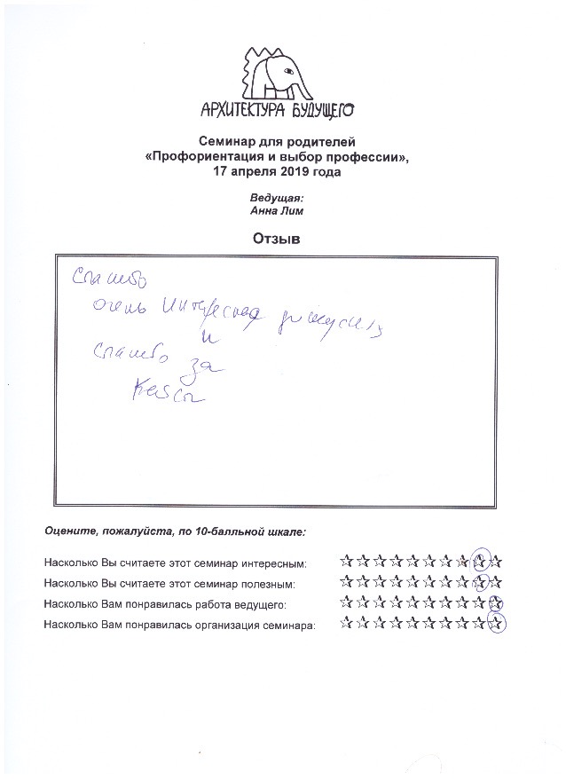 Отзыв№3: Понравилась структурированность подачи современного «рынка» специальностей и грамотное разъяснение, что можно ждать от результатов тестирования. Интересные решения практических задач. Отзыв№ 4: Спасибо большое за программу. Интересно было послушать и познакомиться с опытными психологами, познакомиться с другими родителями и открыть для себя центр «Архитектуа будущего»