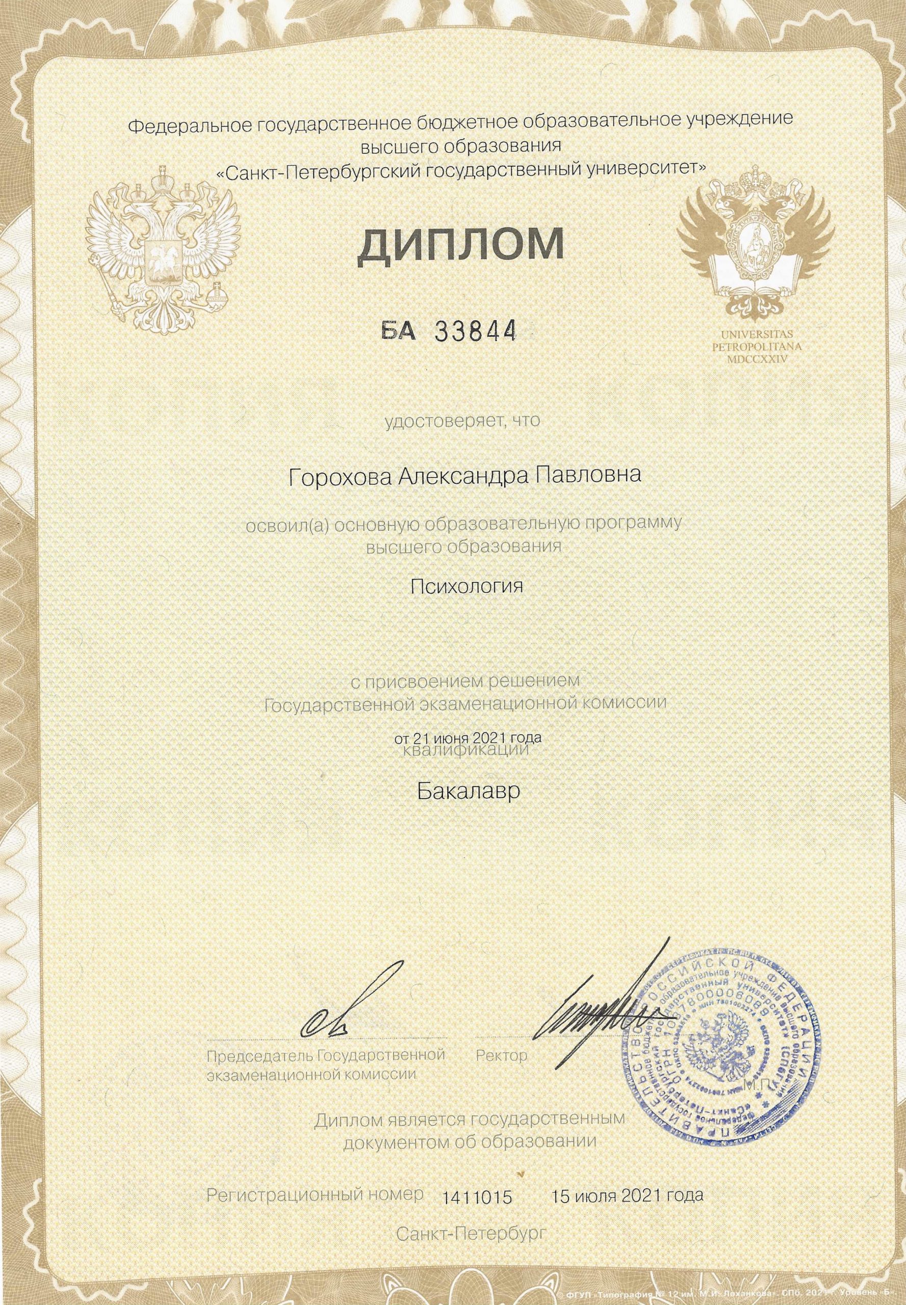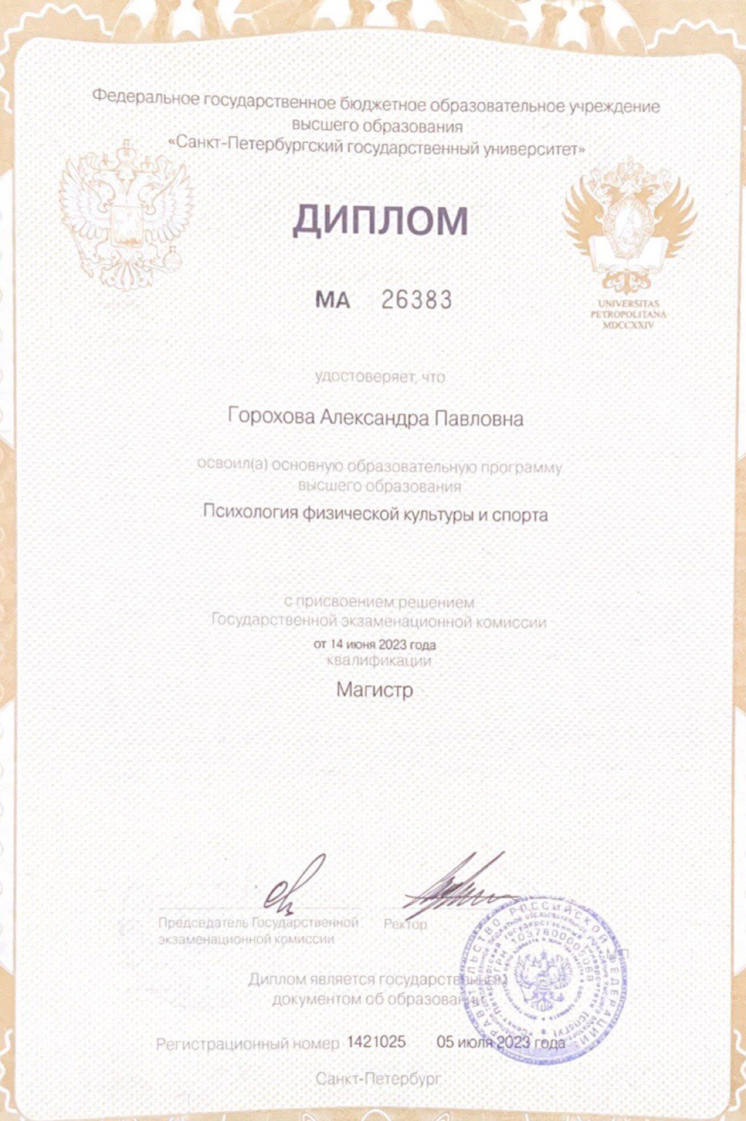 Бакалавриат по направлению «Психология» СПбГУ (2021 г.), Магистратура по направлению "Психология физической культуры и спорта" СПбГУ (2023г.)