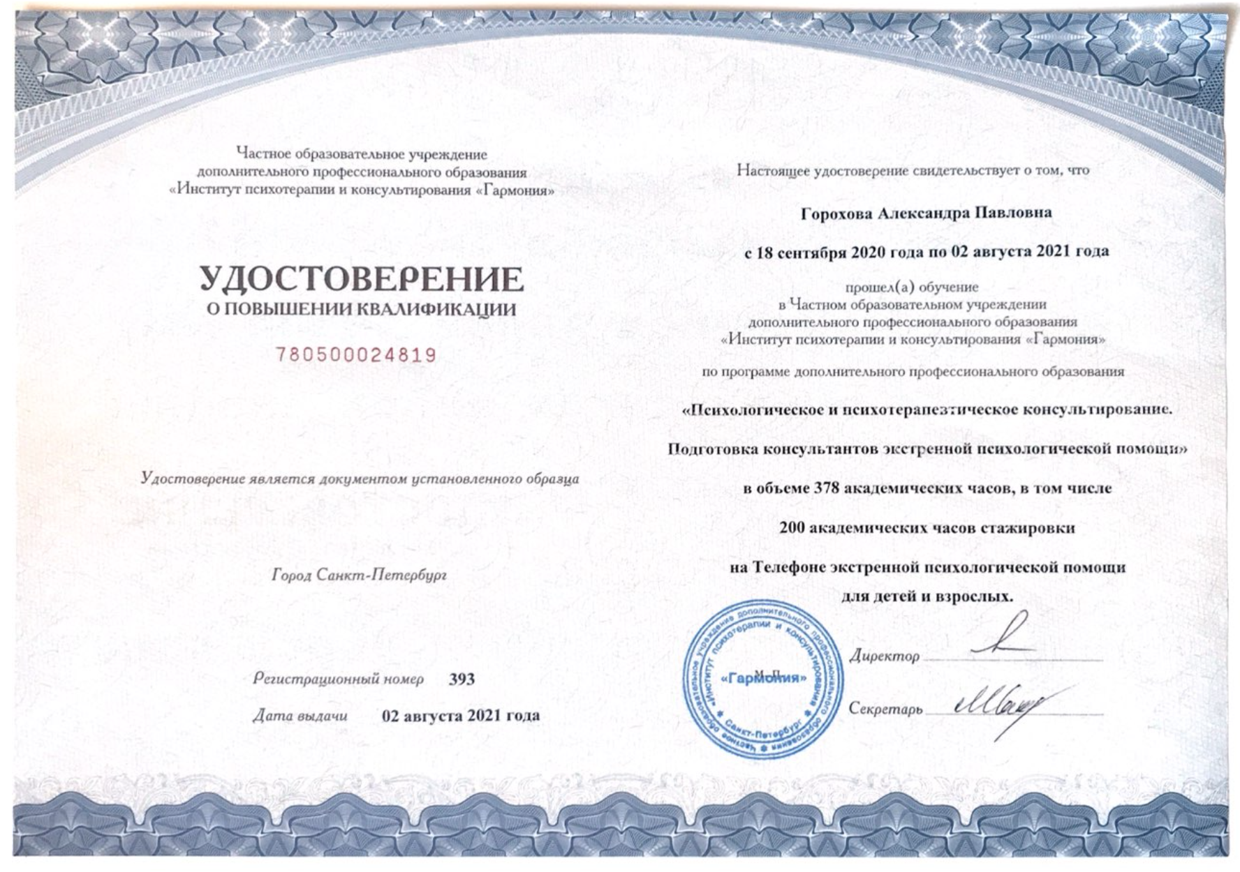 - Повышение квалификации по программе «Психологическое и психотерапевтическое консультирование. Подготовка консультантов экстренной психологической помощи» (378 ак.ч., в том числе 200 ак.ч. стажировки на телефоне экстренной психологической помощи для детей и подростков) ЧОУ ДПО «Институт психотерапии и консультирования «Гармония» (2021г.)