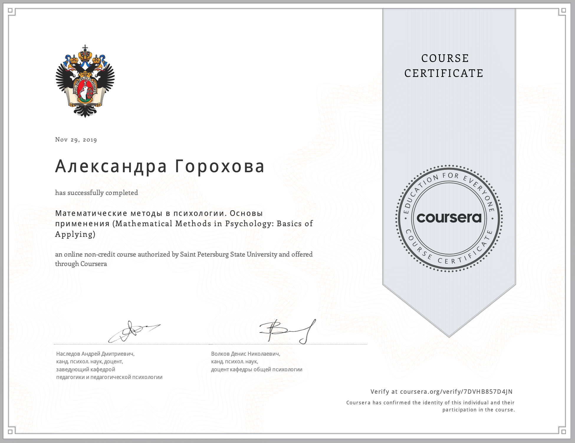 - Участница онлайн-курса «Математические методы в психологии. Основы применения» СПбГУ, Coursera г.Санкт-Петербург (2019г.)