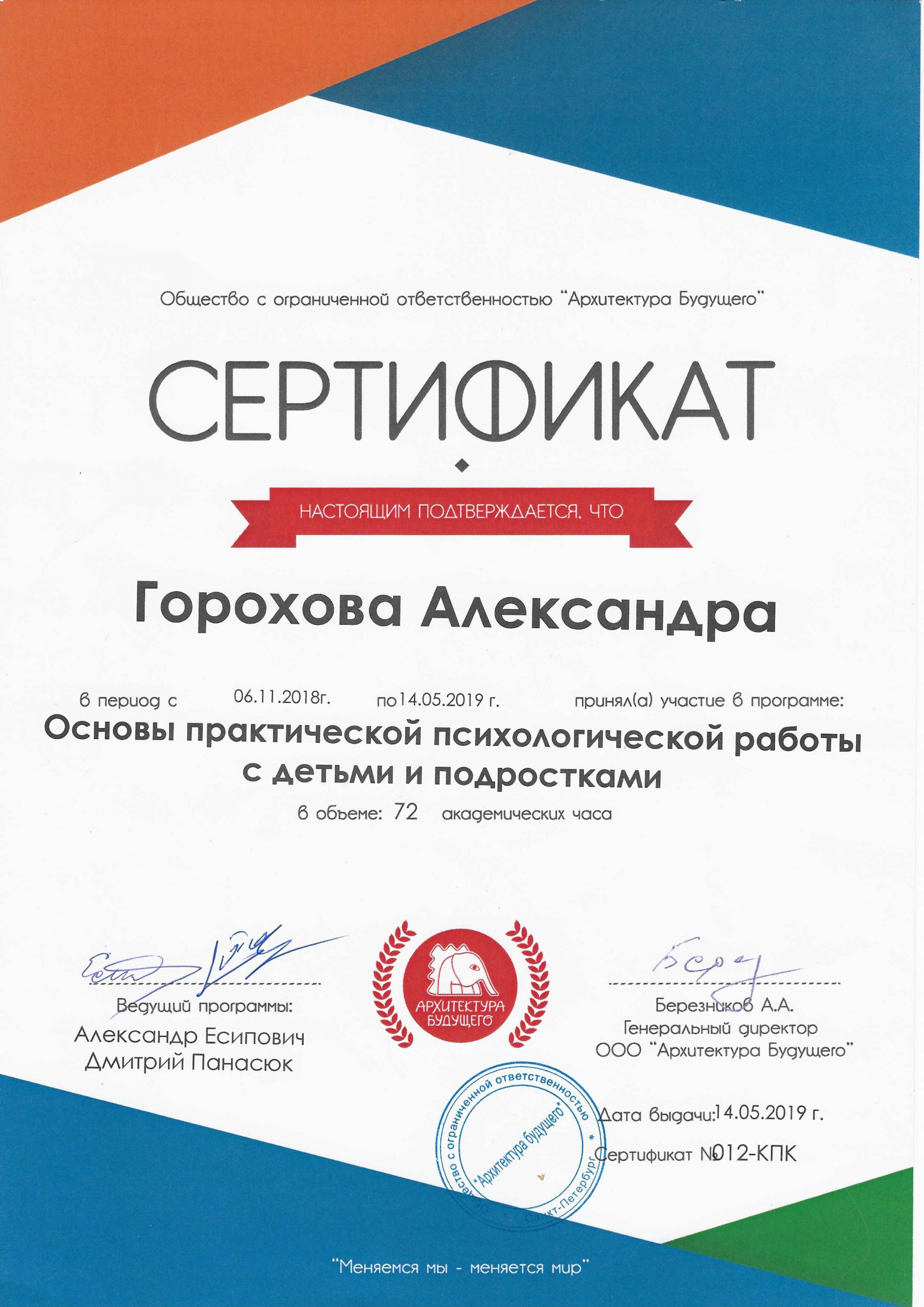 - Участница программы «Основы практической психологической работы с детьми и подростками» (72 ак.ч.) НОУ ДО «Архитектура будущего» г.Санкт-Петербург (2019г.)