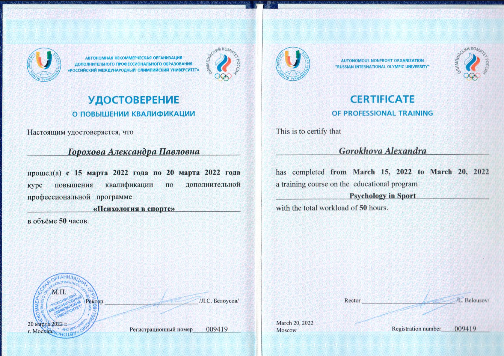 - Повышение квалификации по программе «Психология в спорте» (50 часов) АНО ДПО «Российский международный олимпийский университет» (2022 г.)