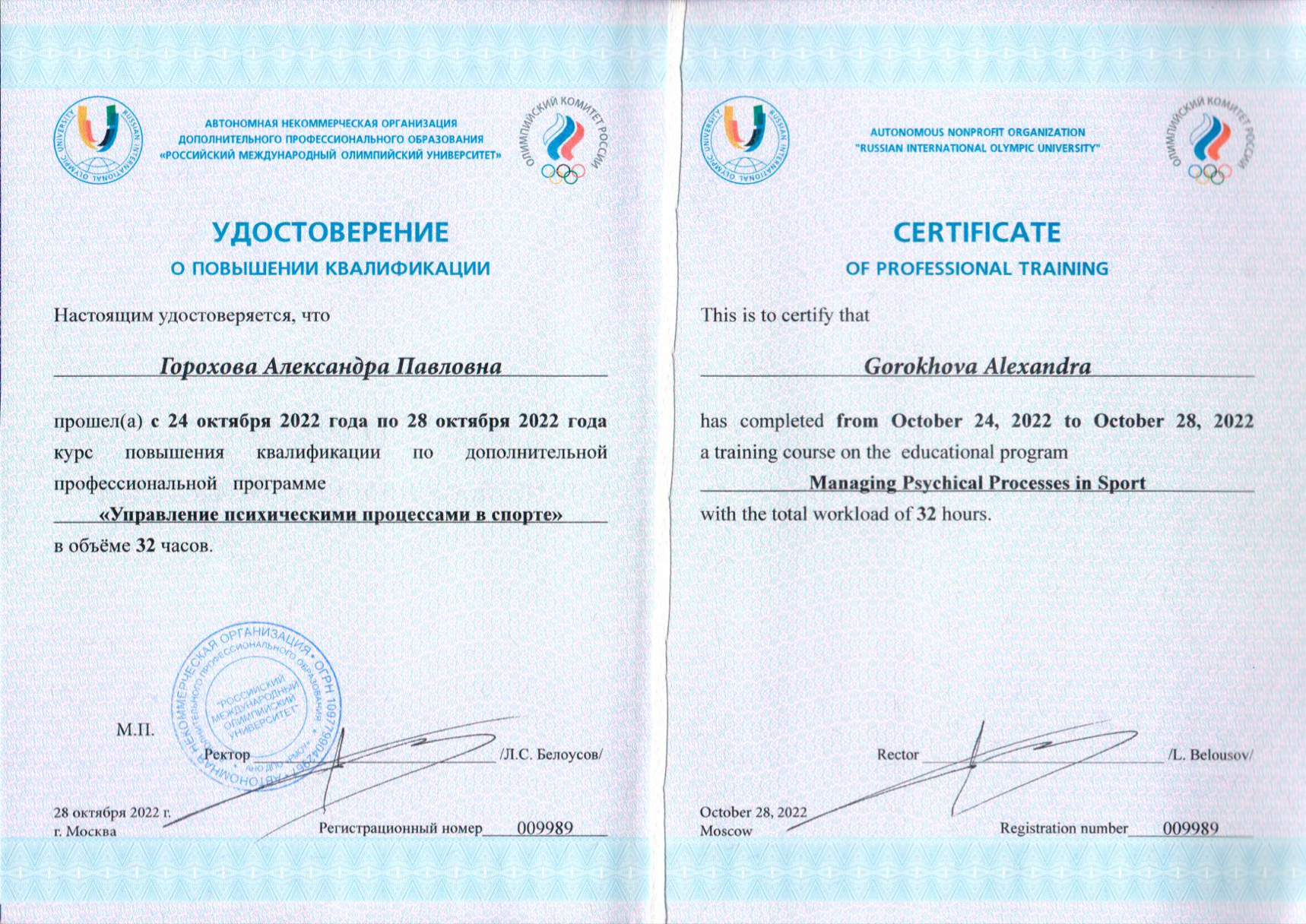 - Повышение квалификации по программе «Управление психическими процессами в спорте» (32 часа)АНО ДПО «Российский международный олимпийский университет» (2022 г.)