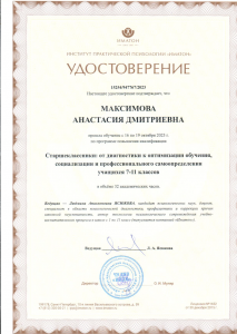 - Повышение квалификации по программе «Старшеклассники: от диагностики к оптимизации обучения, социализации и профессионального самоопределения учащихся 7-11 классов» (32 ак.ч.), Институт практической психологии «Иматон» (2023 г.)