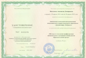 - Повышение квалификации по программе «Методы и технологии профилактики эмоционального выгорания специалистов образовательной среды (20 ак.ч.), НОУ ДО «Архитектура будущего», г.Санкт-Петербург (2023г.)
