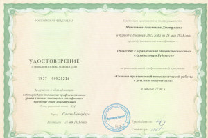 - Повышение квалификации по программе «Основы практической психологической работы с детьми и подростками» (72 ак.ч.), НОУ ДО «Архитектура будущего», г.Санкт-Петербург (2023г.)