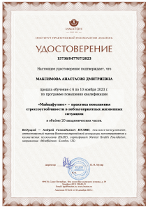- Повышение квалификации по программе «Майндфулнесс: практика повышения стрессоустойчивости в неблагоприятных жизненных ситуациях» (20 ак.ч.), Институт практической психологии «Иматон» (2023 г.)