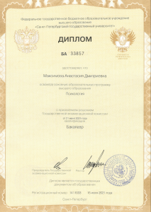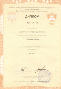 Бакалавриат по направлению «Психология» СПбГУ (2021 г.), Магистратура по направлению "Психология развития и дифференциальной психологии" СПбГУ (2023г.)