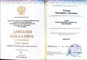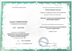 - Повышение квалификации по программе «Основы практической психологической работы с детьми и подростками» (72 ак.ч.), НОУ ДО «Архитектура будущего», г.Санкт-Петербург (2024 г.)
