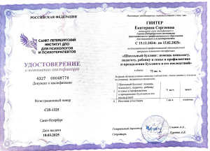 - Повышение квалификации по программе «Школьный буллинг: помощь психологу, педагогу, ребенку и семье в профилактике и преодолении буллинга и его последствий» (72 ак.ч.), СПб институт ДПО для психологов и психотерапевтов, г.Санкт-Петербург (2025 г.)