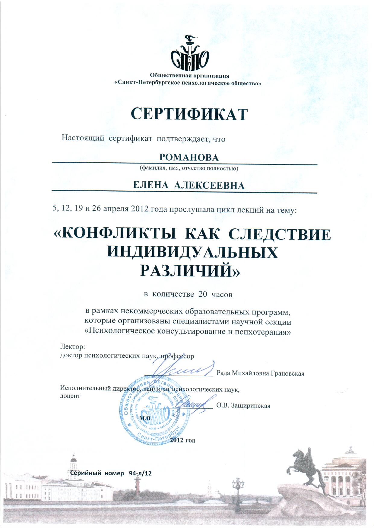 - «Конфликты как следствие индивидуальных различий» (20 ак.ч.) Санкт-Петербургское психологическое общество (2012)