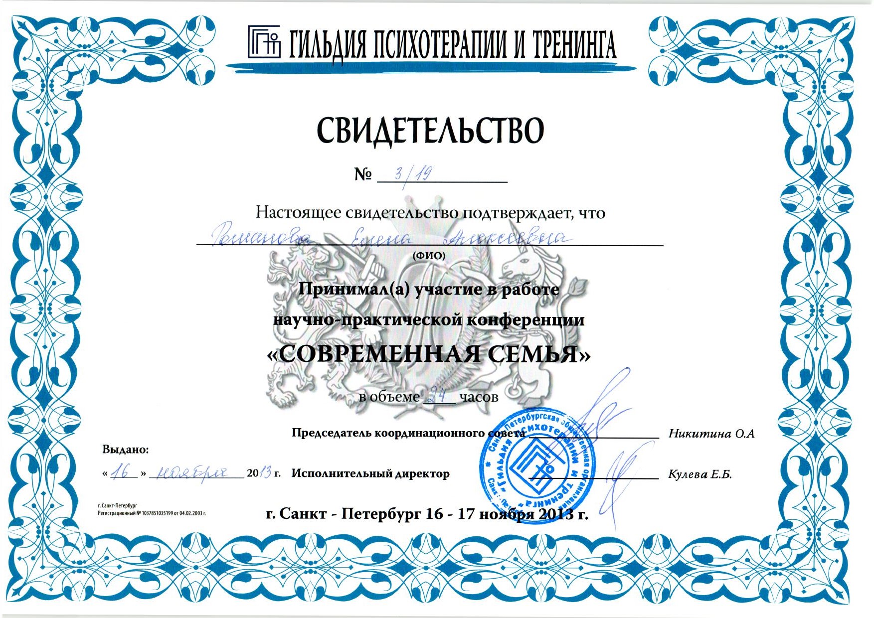 - «Современная семья» (24 ак.ч.) Научно-практическая конференция. Гильдия психотерапии и тренинга (2013)