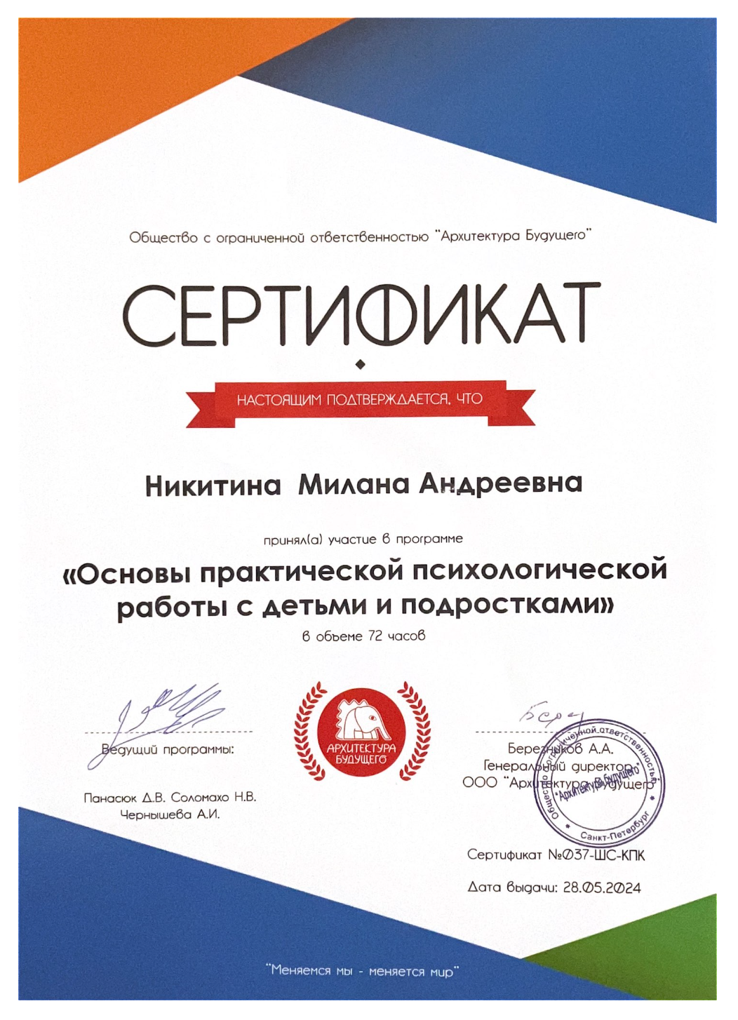 - Повышение квалификации по программе «Основы практической психологической работы с детьми и подростками» (72 ак.ч.), НОУ ДО «Архитектура будущего», г.Санкт-Петербург (2024 г.)