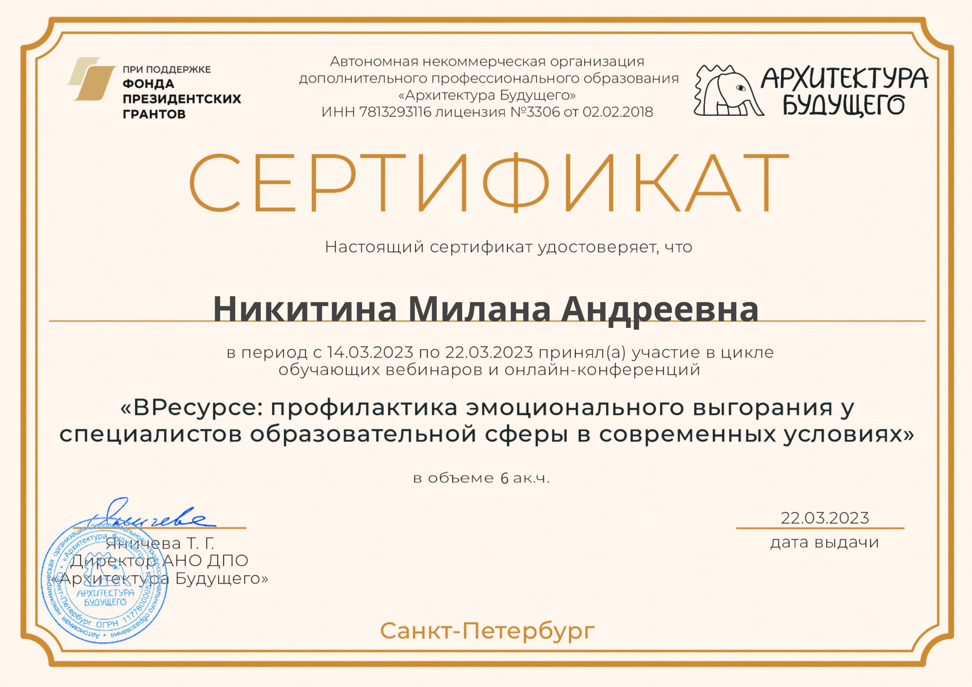 - Участие в цикле обучающих вебинаров и онлайн-конференций по программе «ВРесурсе: профилактика эмоционального выгорания у специалистов образовательной сферы в современных условиях» (6 ак.ч.), НОУ ДО «Архитектура Будущего» (2023г.)