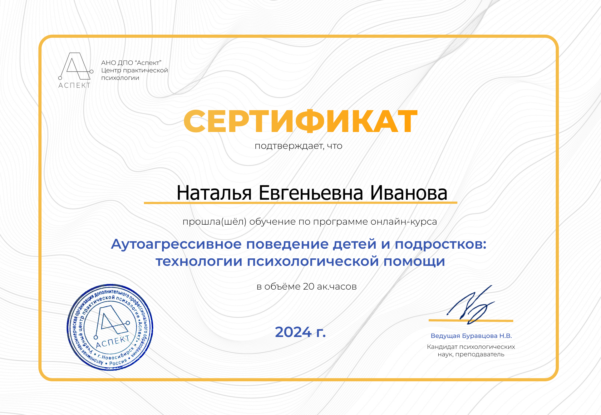 - Обучение по программе «Аутоагрессивное поведение детей и подростков: технологии психологической помощи» (20 ак. ч., 2024г.)