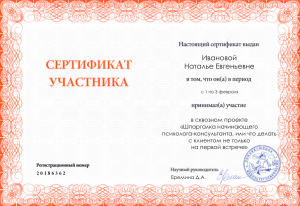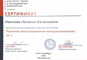 - Участие в авторском тренинге А. М. Ялова «Решение-фокусированное консультирование» (24 ак.ч.), Институт мира и исследования конфликтов, г. Санкт-Петербург (2022г.)