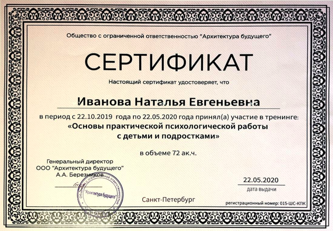 - Повышение квалификации по программе «Основы практической психологической работы с детьми и подростками» (72 ак.ч.), НОУ ДО «Архитектура будущего», г.Санкт-Петербург (2020г.)