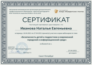 - Участие в онлайн-курсе «Безопасность детей и подростков в современной городской и информационной среде», НОУ ДО «Архитектура будущего», г. Санкт-Петербург (2021г.)