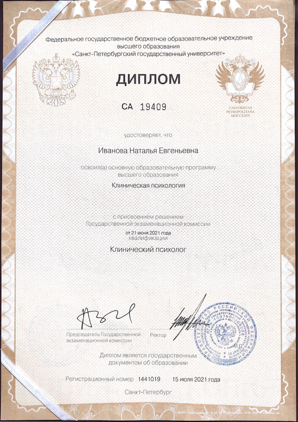 Специалитет по направлению «Клиническая психология», СПбГУ, кафедра психологии кризисных и экстремальных ситуаций (2015-2021г.)