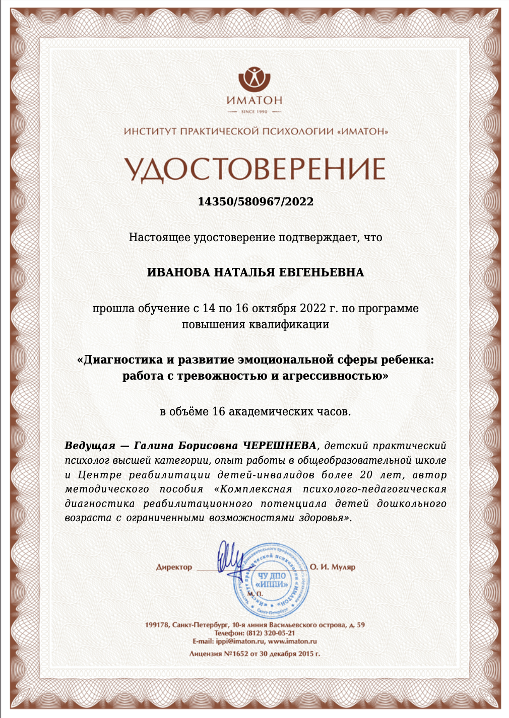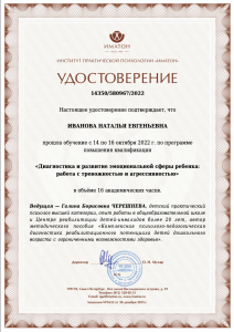- Повышение квалификации по программе «Диагностика и развитие эмоциональной сферы ребенка: работа с тревожностью и агрессивностью» (16 ак.ч.), Институт практической психологии «Иматон» (2022 г.)