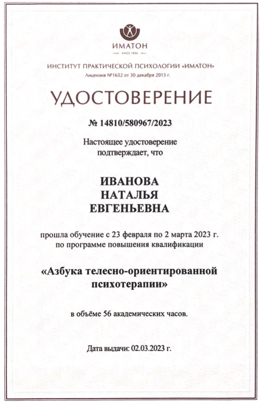 - Повышение квалификации по программе «Азбука телесно-ориентированной психотерапии» (56 ак.ч.), Институт практической психологии «Иматон» (2023 г.)