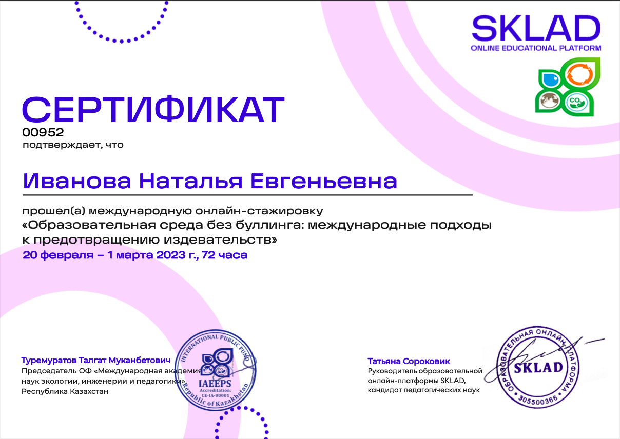 - Участие в международной онлайн-стажировке «Образовательная среда без буллинга: международные подходы к предотвращению издевательств» (72 ак.ч., 2023г.)