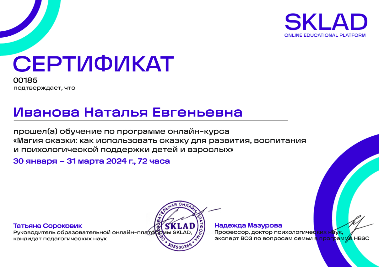 - Участие в программе «Магия сказки: как использовать сказку для развития, воспитания и психологической поддержки детей и взрослых» (72 ак.ч., 2024г.)