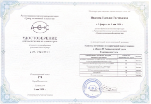 - Повышение квалификации по программе «Основы когнитивно-поведенческой психотерапии» (80 ак.ч., 2024 г.)