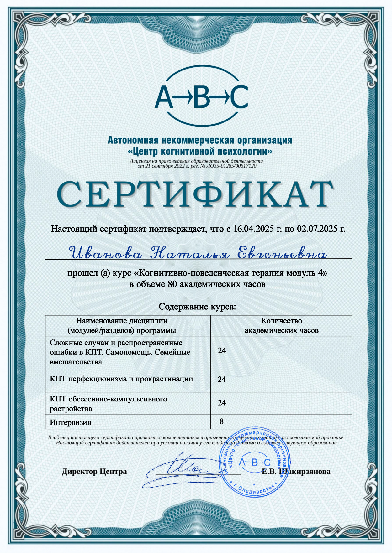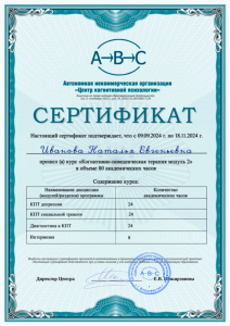 - Обучение по программе «Когнитивно-поведенческая терапия модуль 2» (80 ак.ч., 2024 г.)