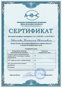 - Обучение по программе «Когнитивно-поведенческая терапия модуль 4» (80 ак.ч., 2025 г.)