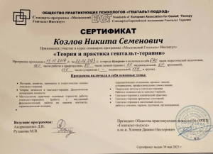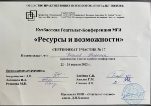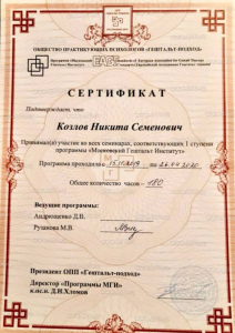 - Базовая программа подготовки Гештальт-терапевта (180ч). Московский Гештальт Институт 2020г