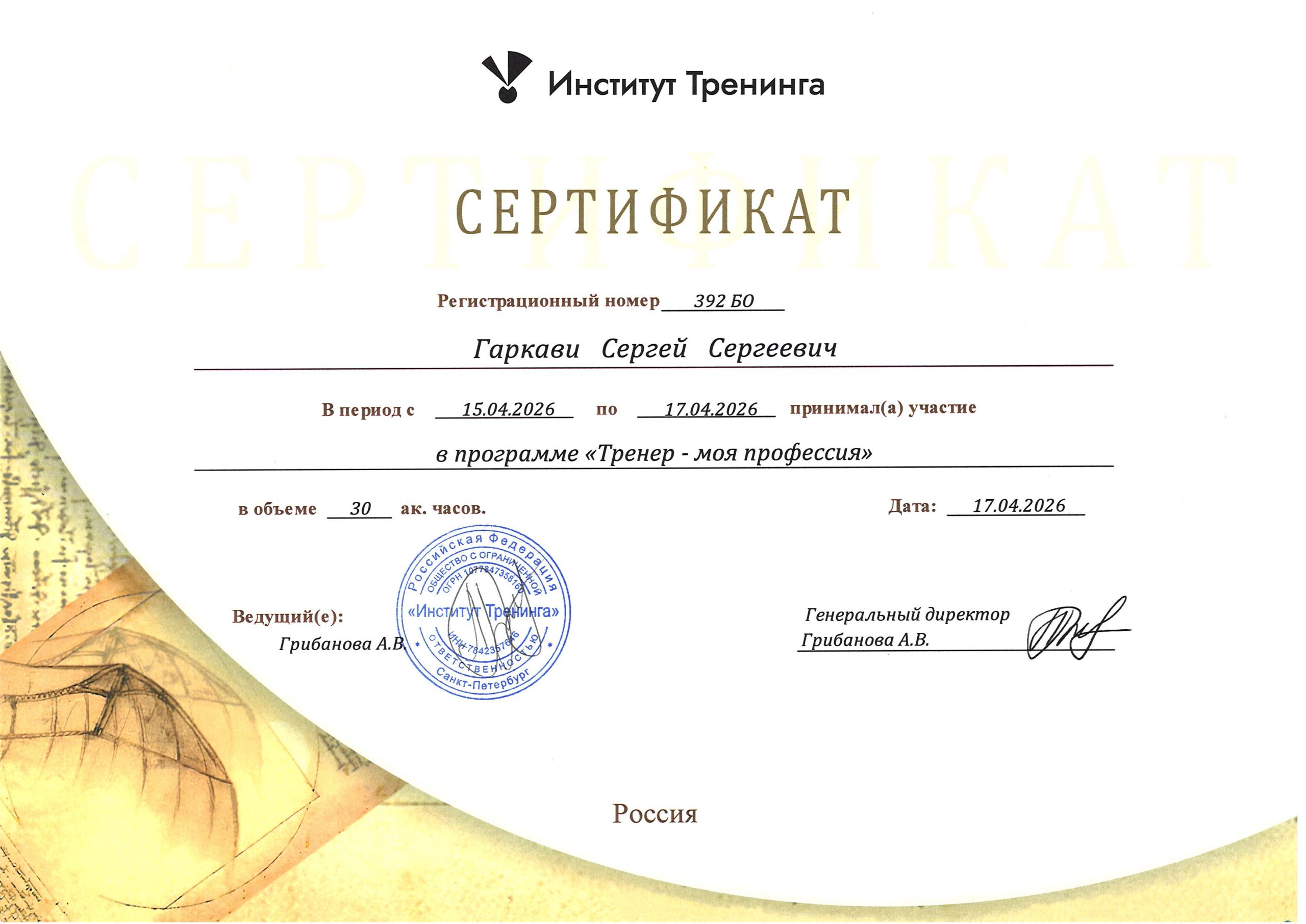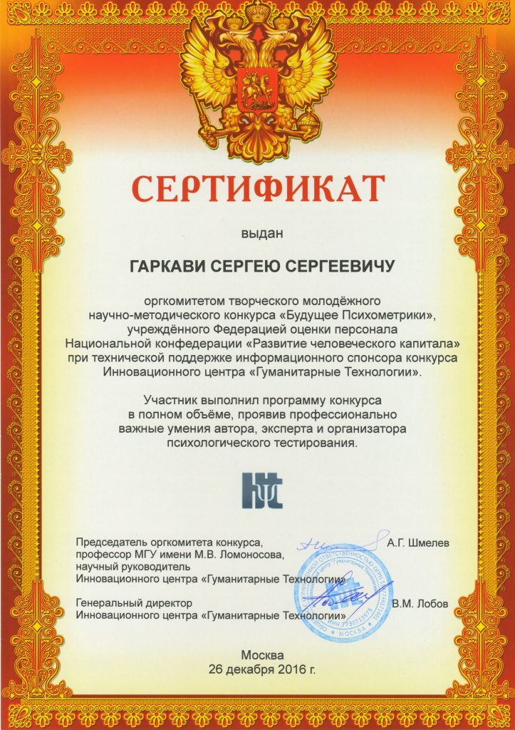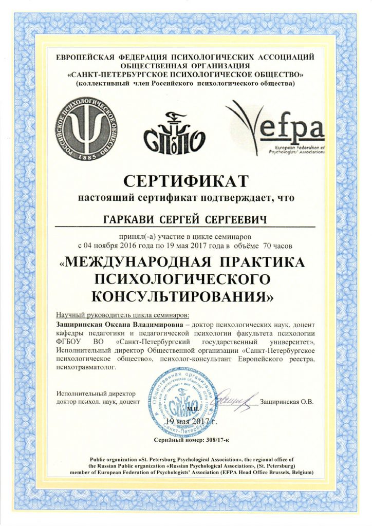 · Участник цикла семинаров по программе «Международная практика психологического консультирования» (70 ак.ч.) EFPA «Санкт-Петербургское психологическое общество» (2017г.)