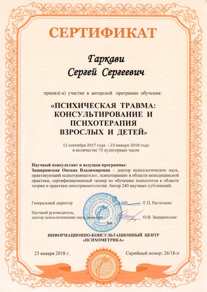· Участник программы «Психическая травма: консультирование и психотерапия взрослых и детей» (70 ак.ч.) Информационно-консультационый центр «Психометрика» (2018г.)