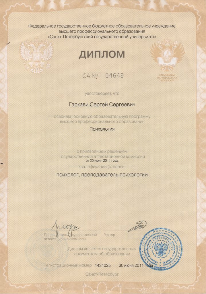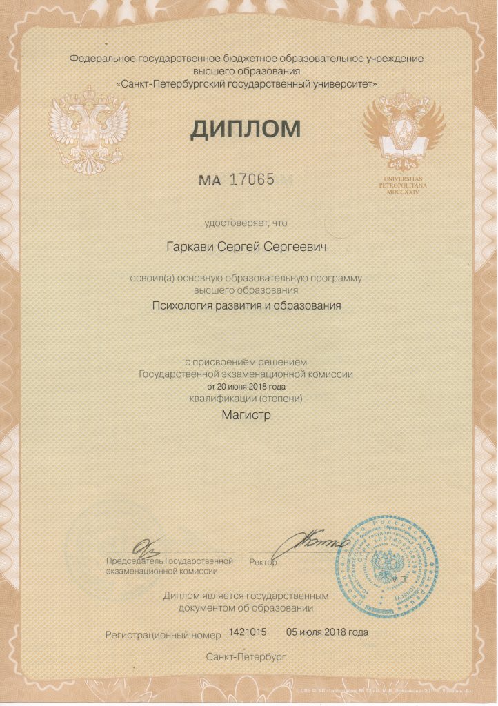 Факультет психологии СПбГУ, кафедра психологического обеспечения профессиональной деятельности, 2006-2011 (специалист); кафедра психологии образования и педагогики, 2016-2018 (магистр)
