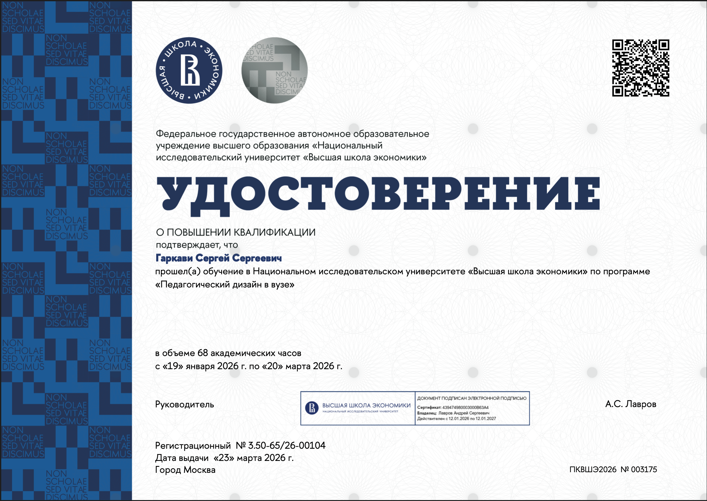 · Повышение квалификации по программе «Педагогический дизайн в вузе» (68 ак.ч.) «Институт образования НИУ ВШЭ» (2026г.)